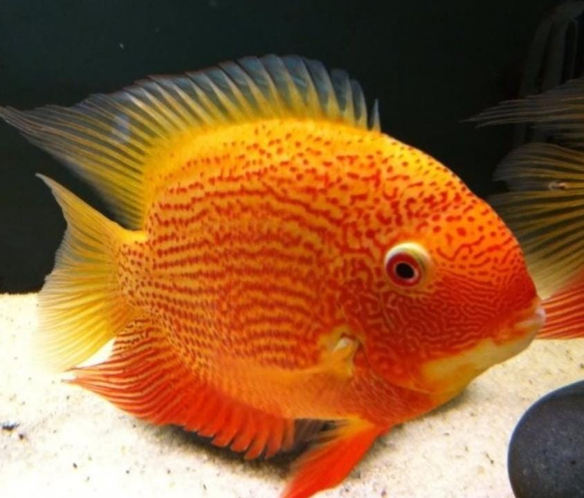 Outras informações: Este híbrido surgiu do cruzamento entre Amphilophus citrinellus e Paraneetroplus synspilus, nos anos 80, em Taiwan. Existem algumas variedades de cor – inclusive exemplares tingidos – e até mesmo uma que não possui nadadeira caudal e o corpo lembra o formato de um coração.